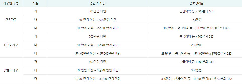 지급액계산은 전년도 연간 부부합산 총 급여액 등을 기준으로 다음의 산식을 반영한 근로장려금 산정표에 따라 계산됩니다.