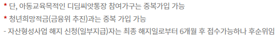 | 내일키움통장, 희망키움1,2통장, NH희망채움통장, KB국민행복적금, IBK 사랑나눔적금, 새희망적금, KEB 1004 나눔적금, 희망드림 적금 |
